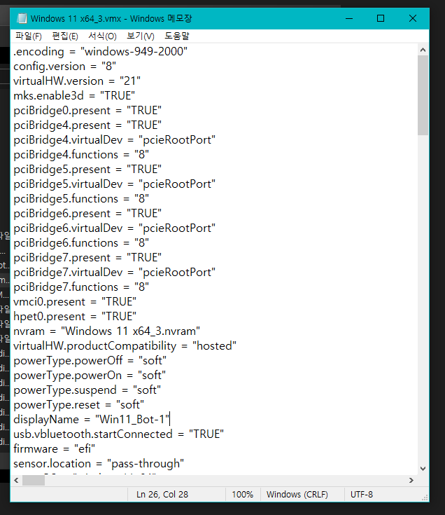 - 활성화하려는 .vmx 파일을 메모장 또는 editor로 연다