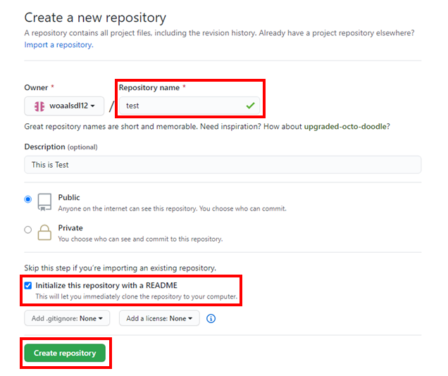 아래는 생성 페이지인데 이름 입력과 README 생성은 꼭 해주자
