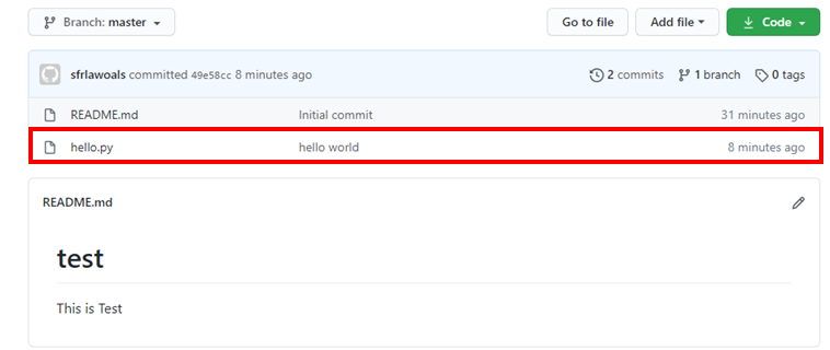 이후 Github 페이지에 접속해보면 파일이 추가된 것을 확인할 수 있다.