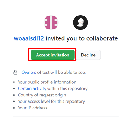 이후 초대받은 사람이 수락하면 저장소를 만든 사람과 같은 권한으로 수정할 수 있게 된다.