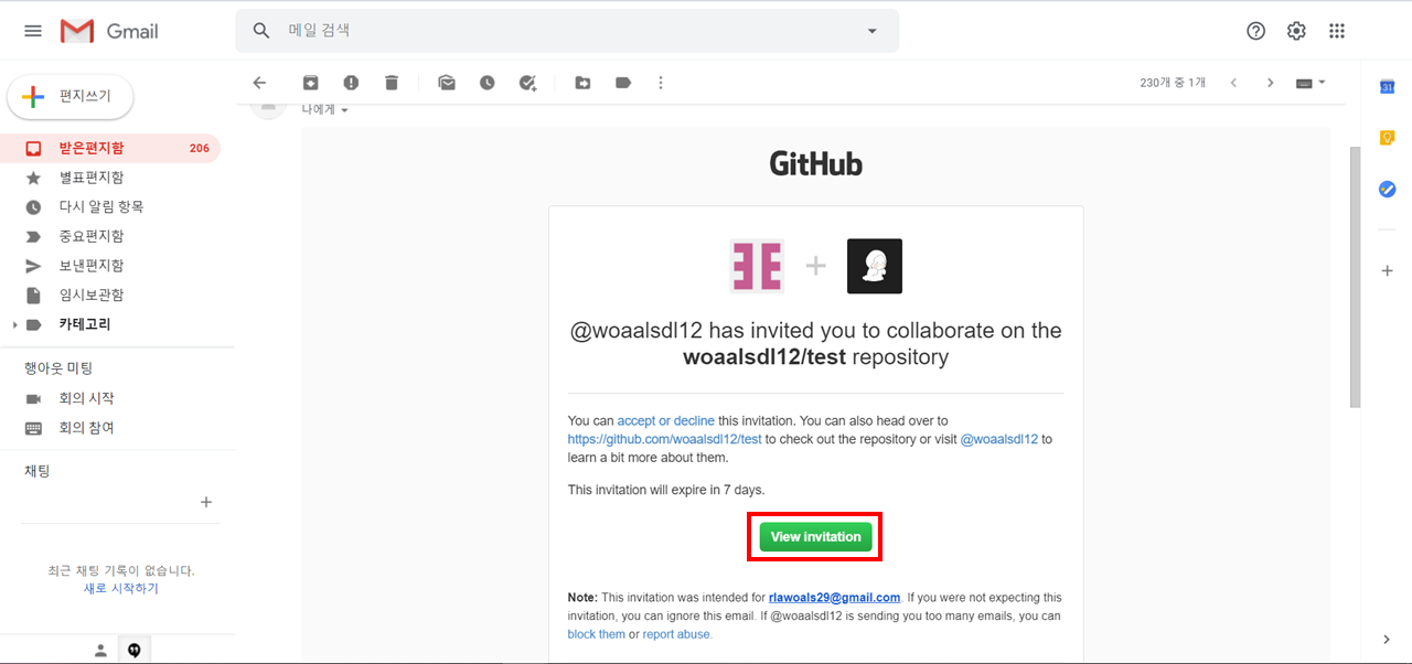 생성자가 보낸 초대장은 Github를 가입할 때 입력한 이메일로 발송된다.
