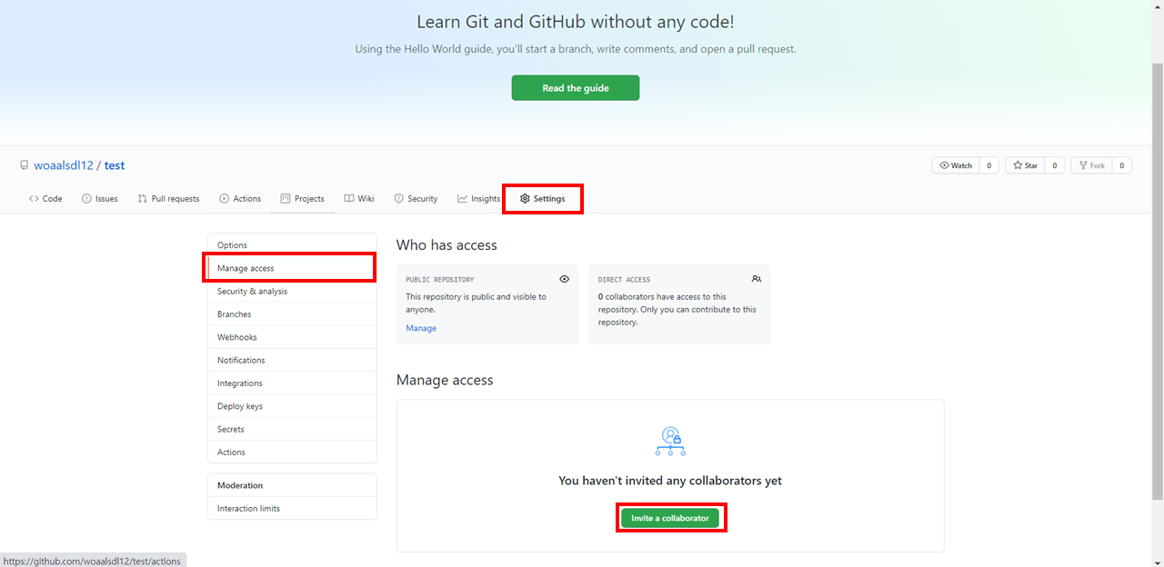 Repository의 Settings -> Manage access를 선택하고, Invite a collaborator를 선택한다.
