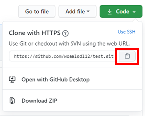 Code 버튼을 누르고 repository 주소를 복사해주자